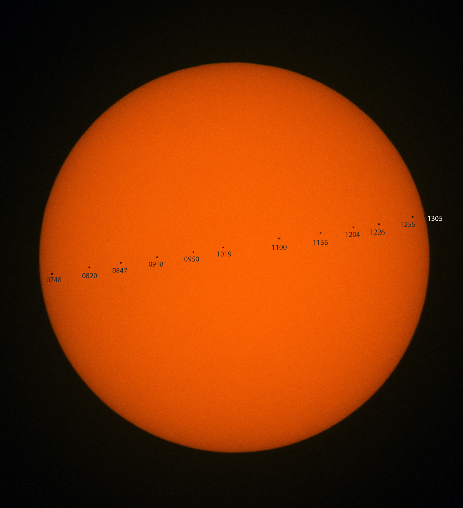 This composite shows the entire transit with times listed in EST. These were taken with the ED80 refractor and Canon T3i camera.