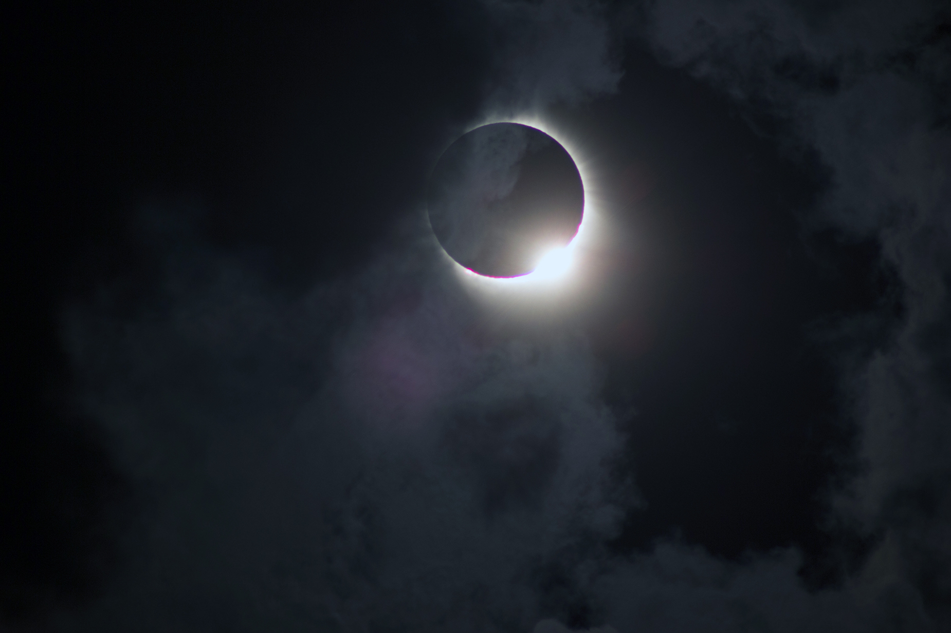 The diamond ring at the end of totality just as the sun exited the steam cloud. This was taken with a 400mm and Canon T3i. Exposure time was 1/160 second at F5.6 and ISO 200.