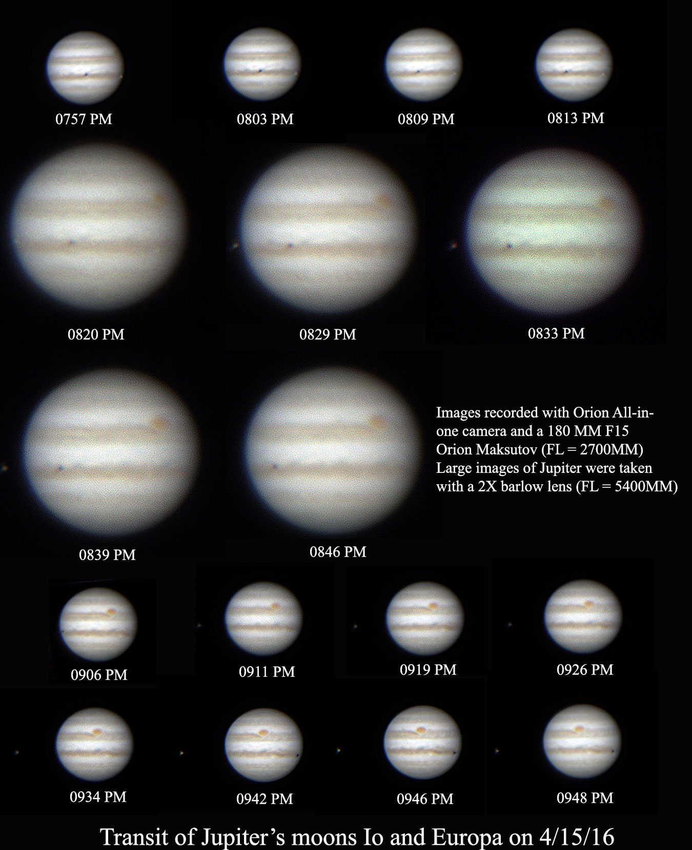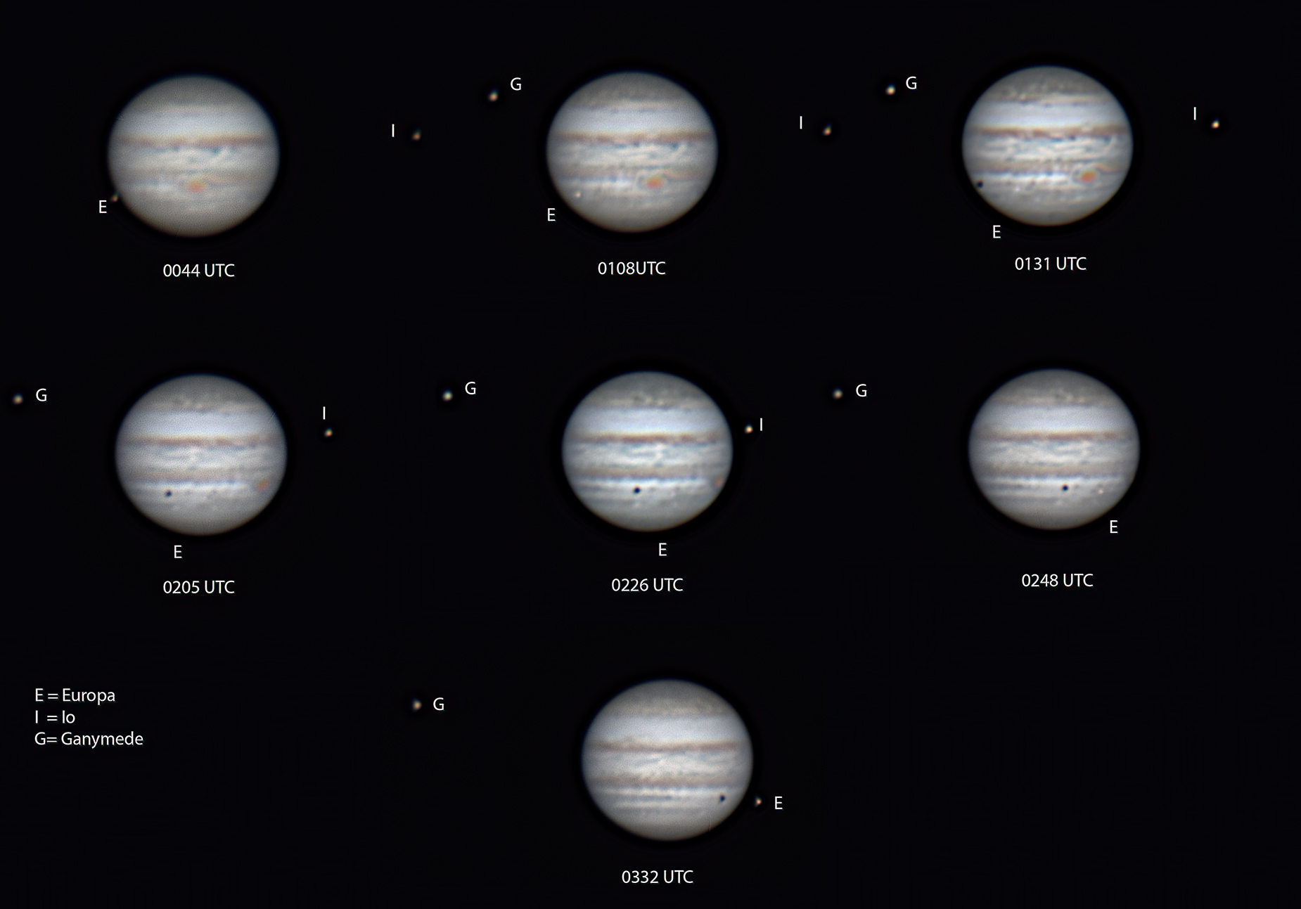 This sequence shows a double transit of Io and Europa. The planet is upside down in this sequence with the moons going right to left. Io can be seen near the left edge of the planet at 8:20 PM as its transit ends. Io's shadow is last seen in the 9:06 PM image. Europa is seen on the right edge of the planet at 7:57 PM and its shadow appears in the 9:42 PM image.