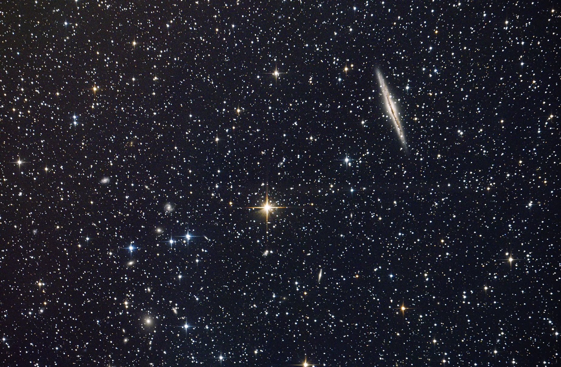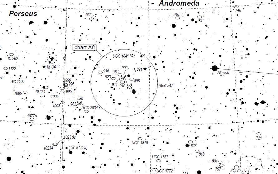 Magnitude: 10.8 Angular size: 14' X 3' NGC 891 is an edge-on galaxy located in Andromeda. The name "outer limits galaxy" comes from the 1960s television show. The end credits would have photographs of galaxies. One of them was NGC 891. While it is close to it, it is not part of the Abell galaxy cluster 347. Many of the galaxies in that cluster are visible to the lower left of center in the image below.