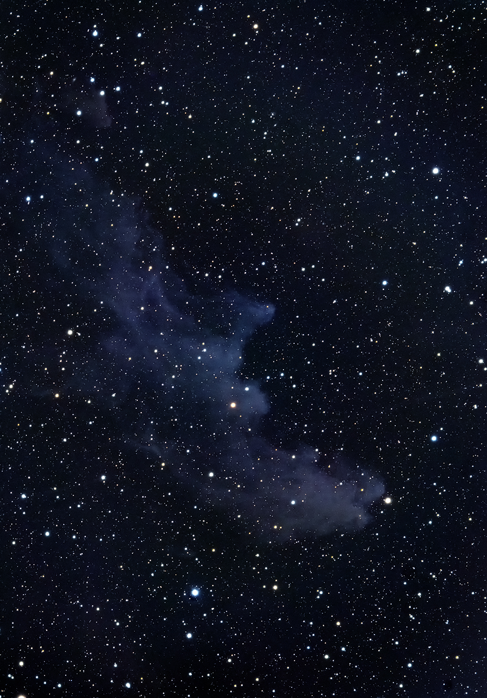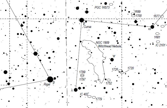 Magnitude: 13.0 Angular size: 3 X 1 degrees This is a reflection nebula that is near the bright star Rigel, which is illuminating the cloud. The shape gives the impression of a witch's head. Its location, in declination, also leads to imaging Geosynchronous satellites crossing the nebula from northerly latitudes. This is best recorded using medium focal length lenses (200-400mm) and APS sensors/Digital SLRs.