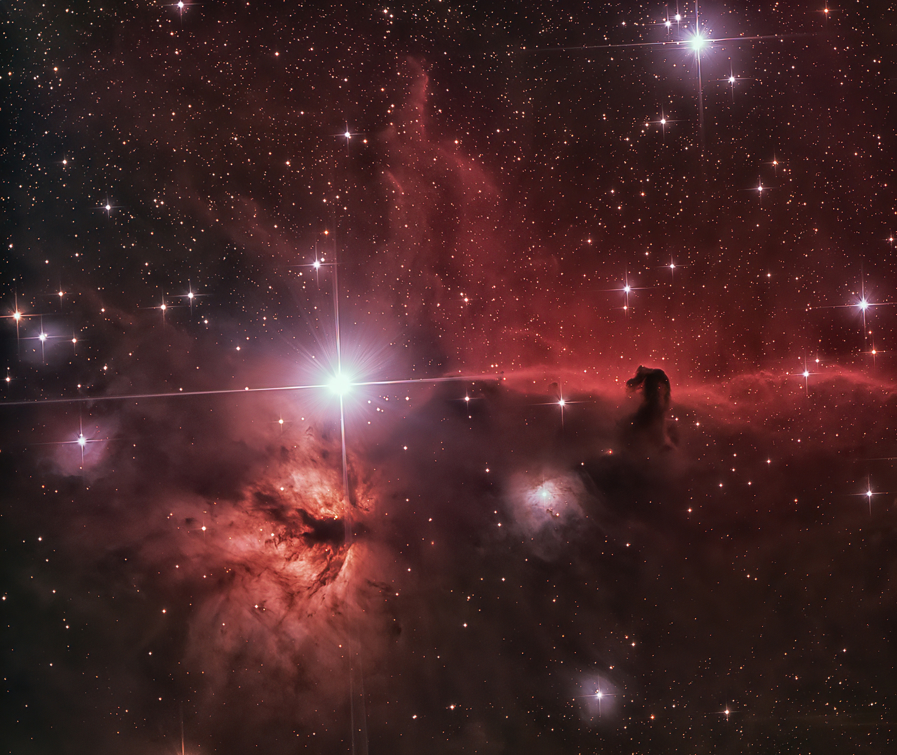 Magnitude: NGC 2024 - 10.0 B33 - 6.8 Angular size: NGC 2024 - 30' X 30' B33 8' X 6' Another object that is frequently photographed is this region of Orion. NGC 2024 is the "Flame" or "Maple leaf" nebula. It is an emission nebula that is unrelated to the star, Alnitak, which is next to it. The main target is B33, which is the Horse Head nebula due its obvious shape. While the "Horse Head" is relatively small, the entire nebula complex is much larger than that. Thi s is a celestial showpiece and needs to be on any astrophotography list.