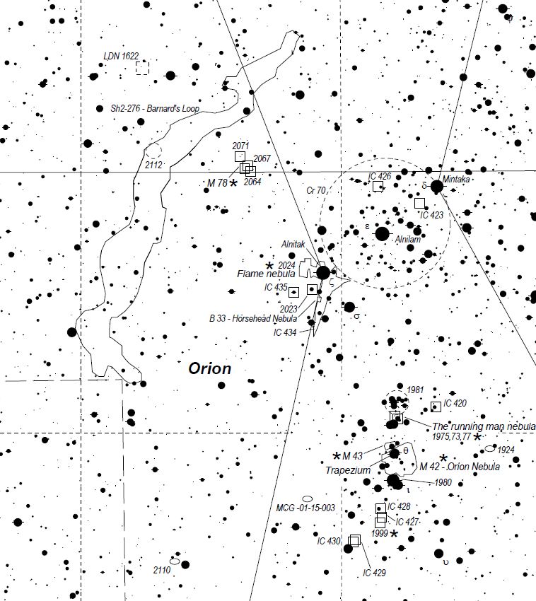 Name: The "Flame" or "Maple leaf" and "Horsehead" nebulae Constellation:Orion Instrument: 8-inch F5 reflector with sky watcher coma corrector and a modified Nikon D3300. Exposure time:16 Five-minute exposures at ISO 800.This is a mosaic of two images both with the same exposure times. Star Chart from Michael Vlasov's Deep sky hunter star atlas available on line https://www.deepskywatch.com/deep-sky-hunter-atlas.html |