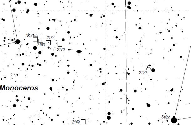 Name: None Constellation:Monoceros Instrument: 8-inch F5 reflector with a sky watcher coma corrector and an ASI 2600 MC (gain 100 -20C) Exposure time:A stack of 27 five-minute and 12 three-minute exposures. Star Chart from Michael Vlasov's Deep sky hunter star atlas available on line https://www.deepskywatch.com/deep-sky-hunter-atlas.html |