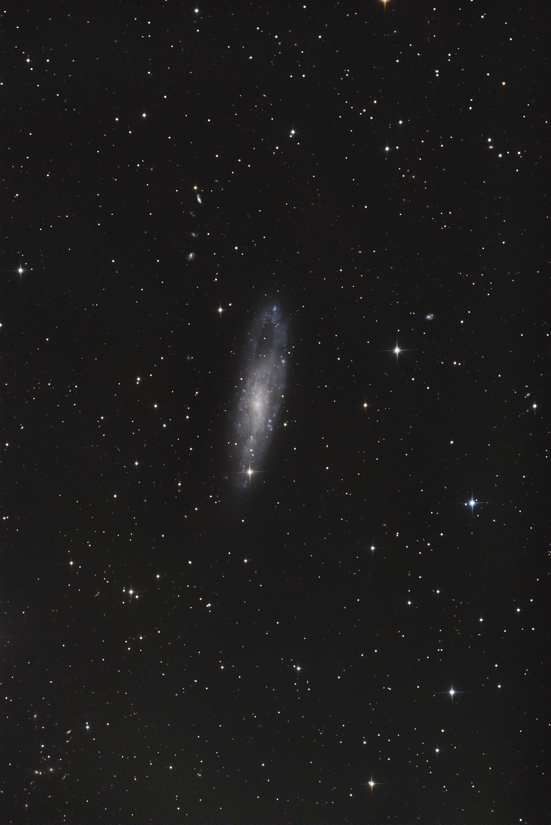 Angular size: 21' X 7' NGC 247 is a spiral galaxy in the constellation of Cetus and is part of the Sculptor galaxy group. Often overshadowed by nearby NGC 253 (AP#4), this galaxy is unique in that it has an empty area on one side of the galaxy, which gives it its claw-like/needle's eye appearance. There area also some smaller galaxies nearby that are unrelated to NGC 247. Five of them are in a row and compose "Burbidge's chain". They are visible in this image to the upper left of the galaxy.