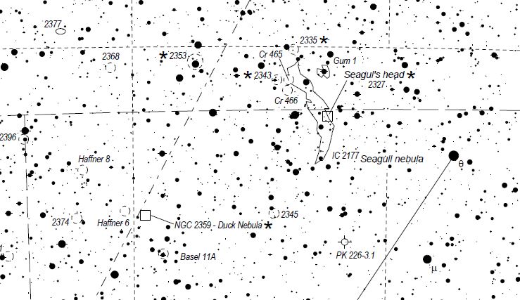 Name: The "Seagull" Nebula Constellation:Monoceros Instrument: Orion ED80 with a F6 focal reducer and a modified Canon T3i. Exposure time: A stack of 6 ten-minute and 10 five-minute exposures at ISO 800. Star Chart from Michael Vlasov's Deep sky hunter star atlas available on line https://www.deepskywatch.com/deep-sky-hunter-atlas.html |