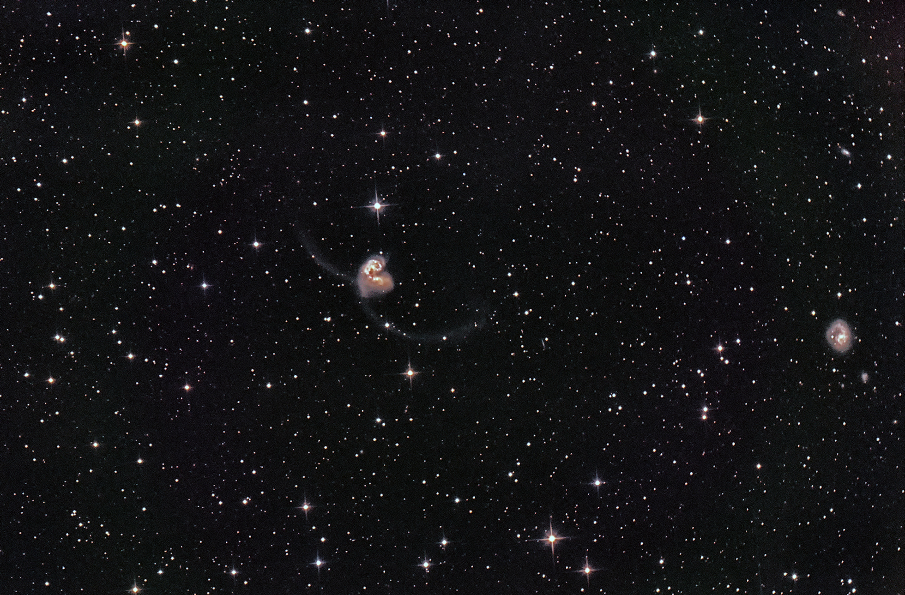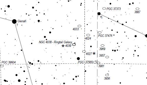 Name: The "Antennae Galaxies" or "Ringtail" Galaxy. Constellation:Corvus Instrument: 8-inch F5 reflector with sky watcher coma corrector and modified Nikon D3300. Exposure time: A stack of 16 five-minute exposures at ISO 800. Star Chart from Michael Vlasov's Deep sky hunter star atlas available on line https://www.deepskywatch.com/deep-sky-hunter-atlas.html |