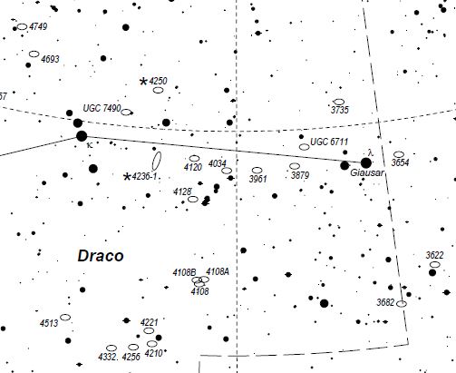Name: The "Cool blue galaxy" Constellation:Draco Instrument: 6-inch F5 reflector and modified Canon T3i. Exposure time: A stack of 16 five-minute exposures at ISO 800. Star Chart from Michael Vlasov's Deep sky hunter star atlas available on line https://www.deepskywatch.com/deep-sky-hunter-atlas.html |
