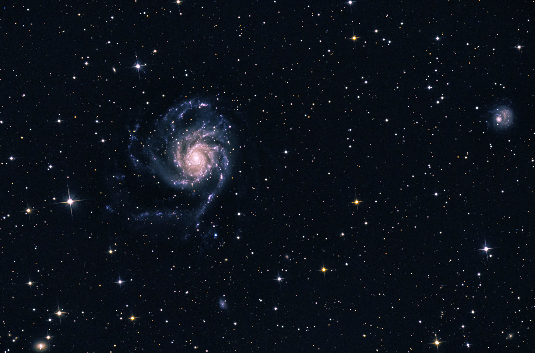 Magnitude: 7.9 Angular size: 28.8' X 26.9' M101 is a large spiral galaxy found near the handle of the big dipper asterism. Visually, it has a low surface brightness but photographically, it is a spectacular object and it resembles a child's pinwheel. There are multiple adjacent galaxies in the field of view which are part of the M101 grouping. The most interesting is the peculiar dwarf galaxy, NGC 5474, which is visible to the right in this image.