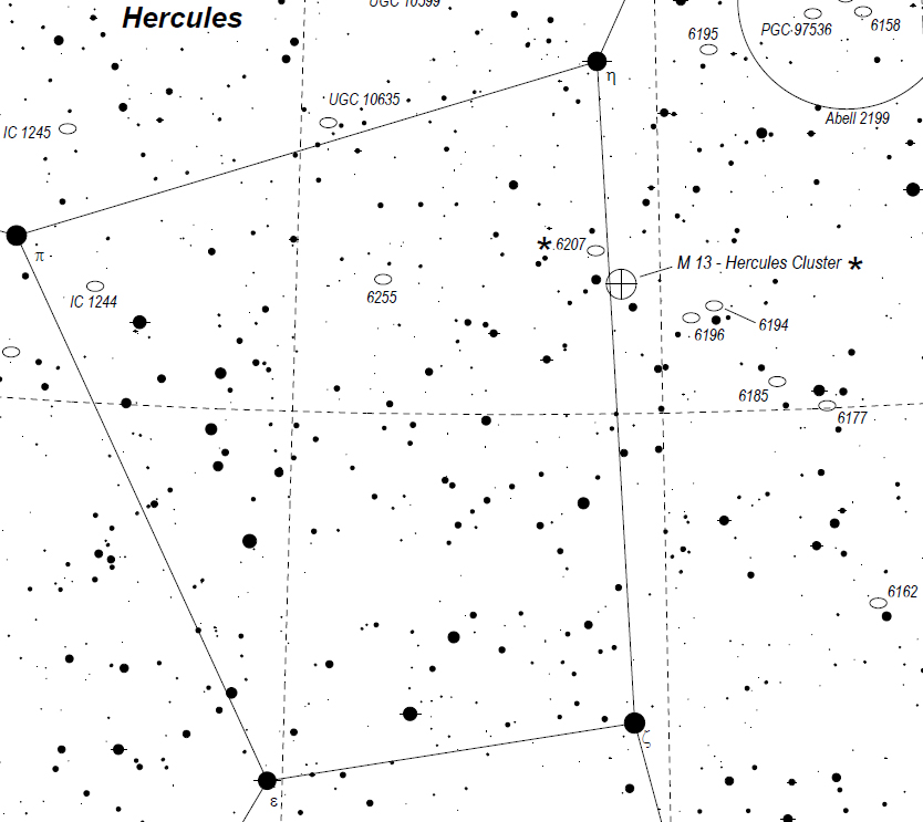 Name: The "Great Hercules"cluster Constellation:Hercules Instrument: 8-inch F5 reflector with sky watcher coma corrector and a modified Nikon D3300. Exposure time: A stack of 16 five-minute exposures at ISO 800. Star Chart from Michael Vlasov's Deep sky hunter star atlas available on line https://www.deepskywatch.com/deep-sky-hunter-atlas.html |