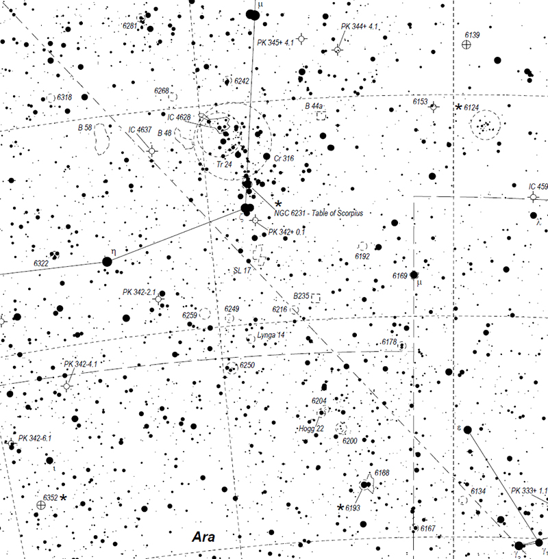 Name: The "Dragons of Ara" or "Firebird" Nebula. Constellation:Ara Instrument:8-inch F5 reflector with Sky Watcher coma corrector and ASI 2600 MC (gain 100 -20C). Exposure time: A stack of 16 five-minute exposures. Star Chart from Michael Vlasov's Deep sky hunter star atlas available on line https://www.deepskywatch.com/deep-sky-hunter-atlas.html |