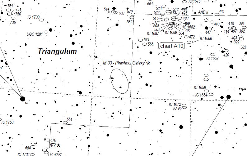 Name: The "Triangulum" or "Pinwheel" galaxy Constellation:Triangulum Instrument: 8-inch F5 reflector with a Sky Watcher coma corrector and an ASI 2600 MC (Gain 100 -20C) Exposure time:16 Five-minute and 9 three-minute exposures. Star Chart from Michael Vlasov's Deep sky hunter star atlas available on line https://www.deepskywatch.com/deep-sky-hunter-atlas.html |