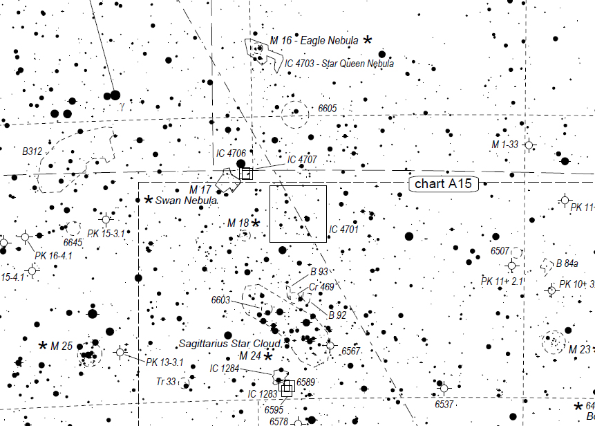 Name: The "Omega" or "Swan" Nebula. Constellation:Sagittarius Instrument:8-inch F5 reflector with Sky Watcher coma corrector and a modified Nikon D3300. Exposure time: A stack of 16 five-minute exposures at ISO 800. Star Chart from Michael Vlasov's Deep sky hunter star atlas available on line https://www.deepskywatch.com/deep-sky-hunter-atlas.html |