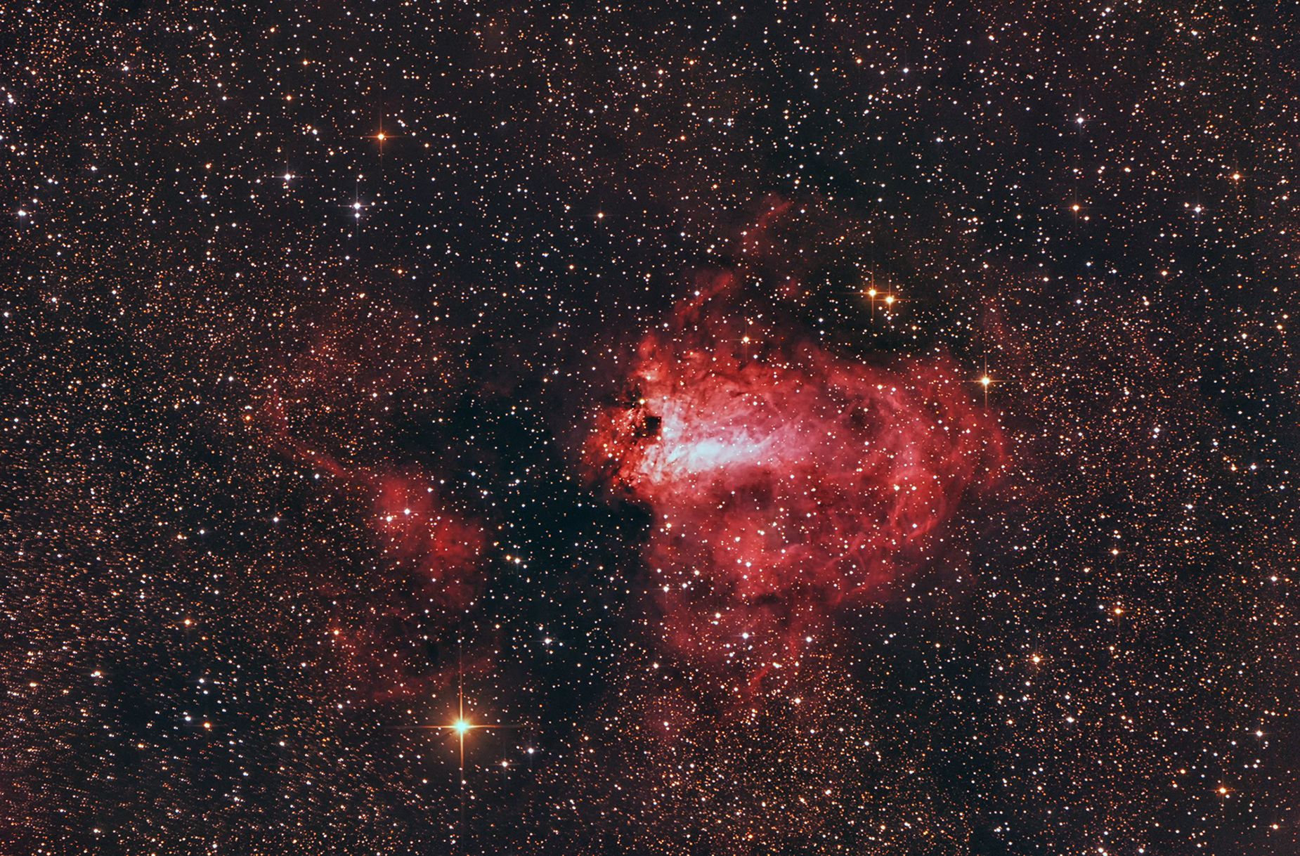 Magnitude: 6.0 Angular size: 11' This is a bright emission nebula just north of the Sagittarius star cloud (M24). The most notable feature is the horseshoe shaped feature that gives the nebula its name.