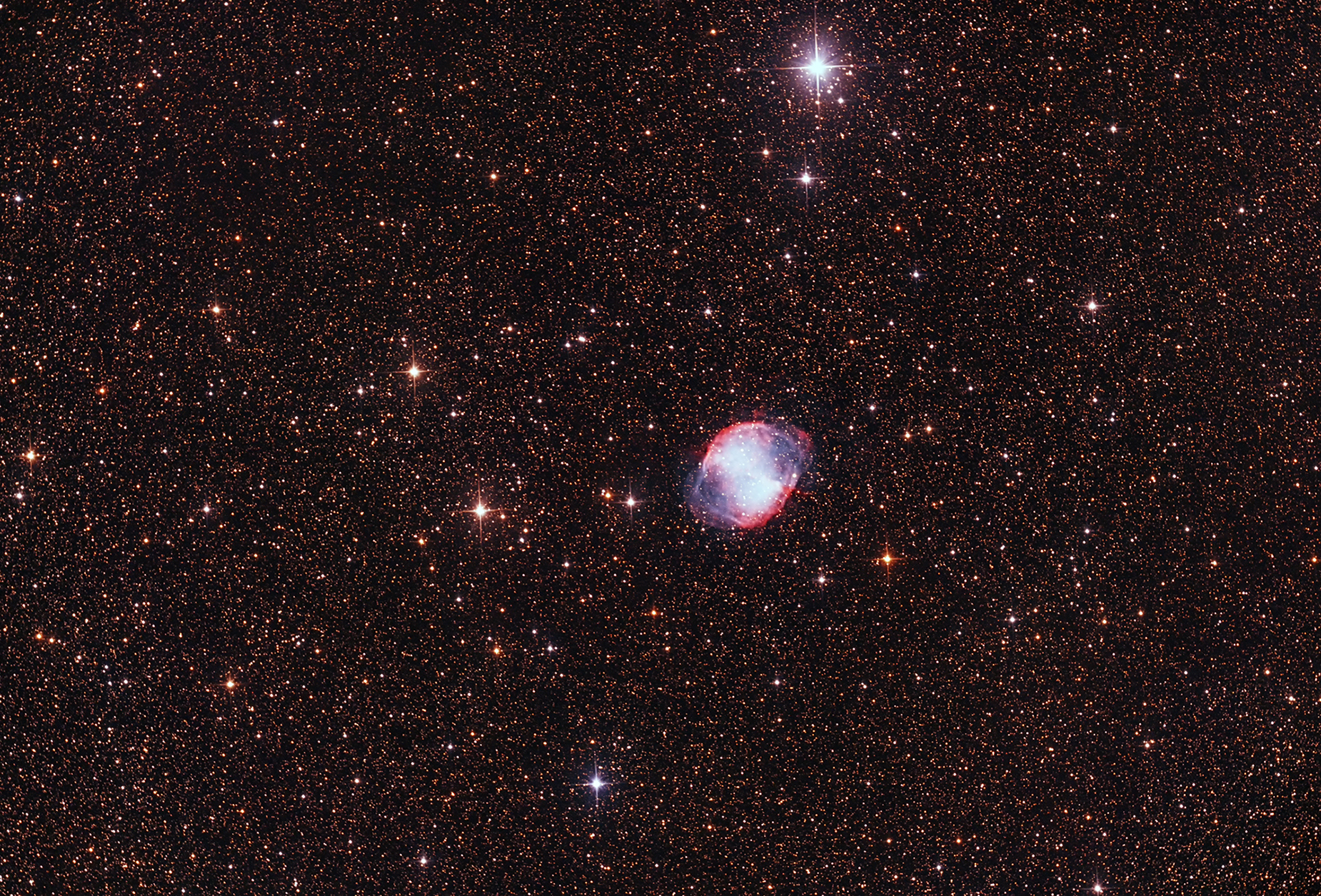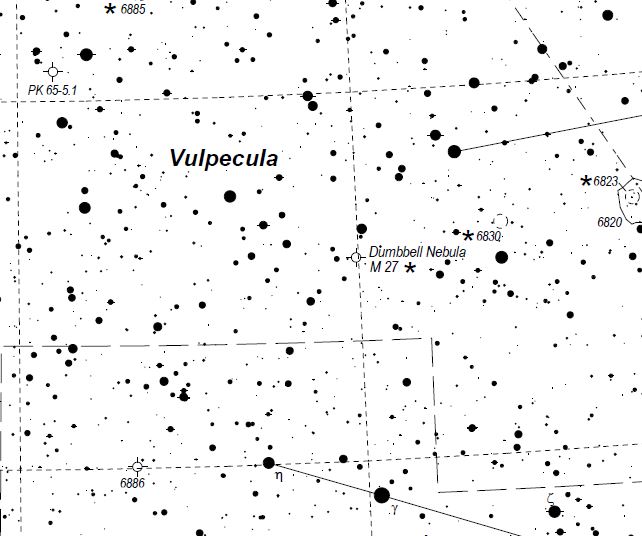 Name: The "dumbbell" nebula. Constellation:Vulpecula Instrument:8-inch F5 reflector with Sky Watcher coma corrector and a modified Canon T6i. Exposure time: A stack of 16 five-minute exposures at ISO 800. Star Chart from Michael Vlasov's Deep sky hunter star atlas available on line https://www.deepskywatch.com/deep-sky-hunter-atlas.html |