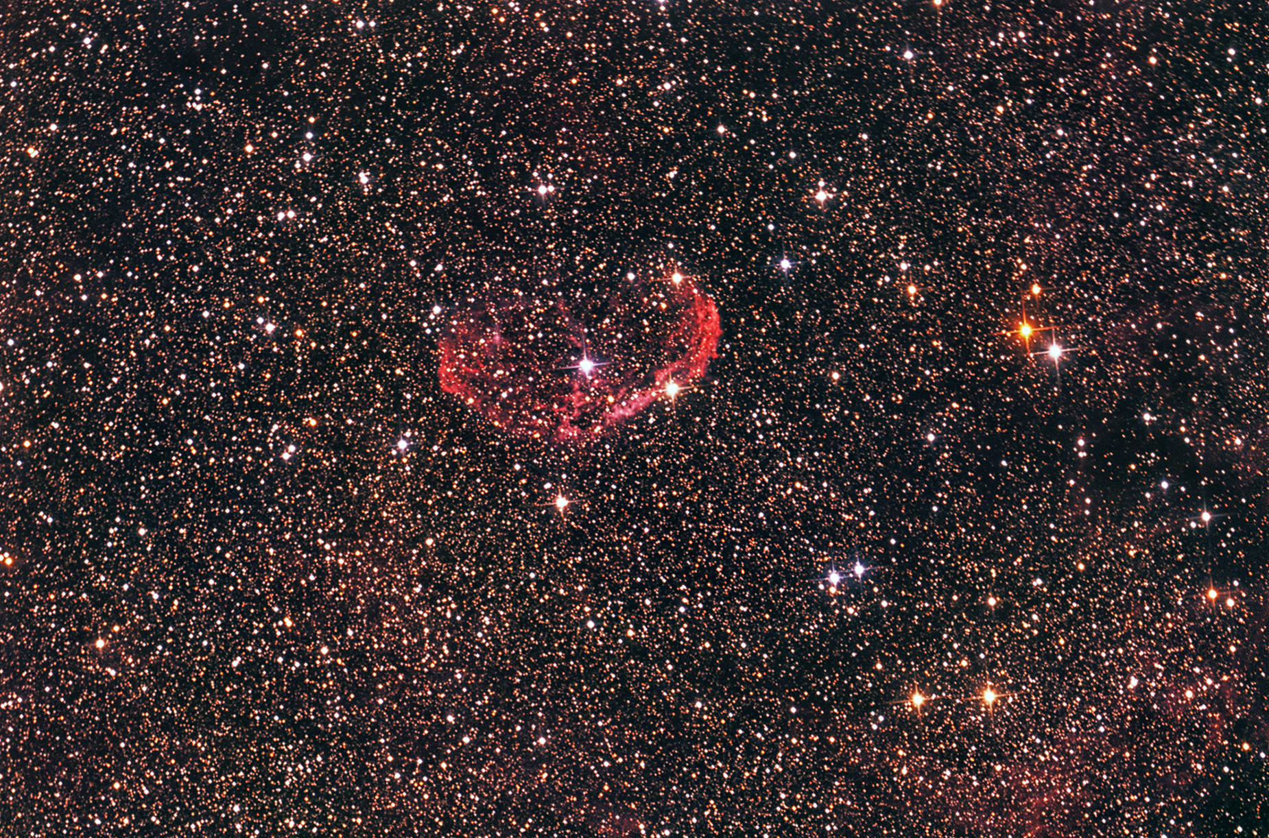 Magnitude: 7.4 Angular size: 18' X 12' This is a nebula formed by the Wolf-Rayet star WR 136. Visually, the nebula is a faint halo shape with one side being brighter and creating the crescent shape.