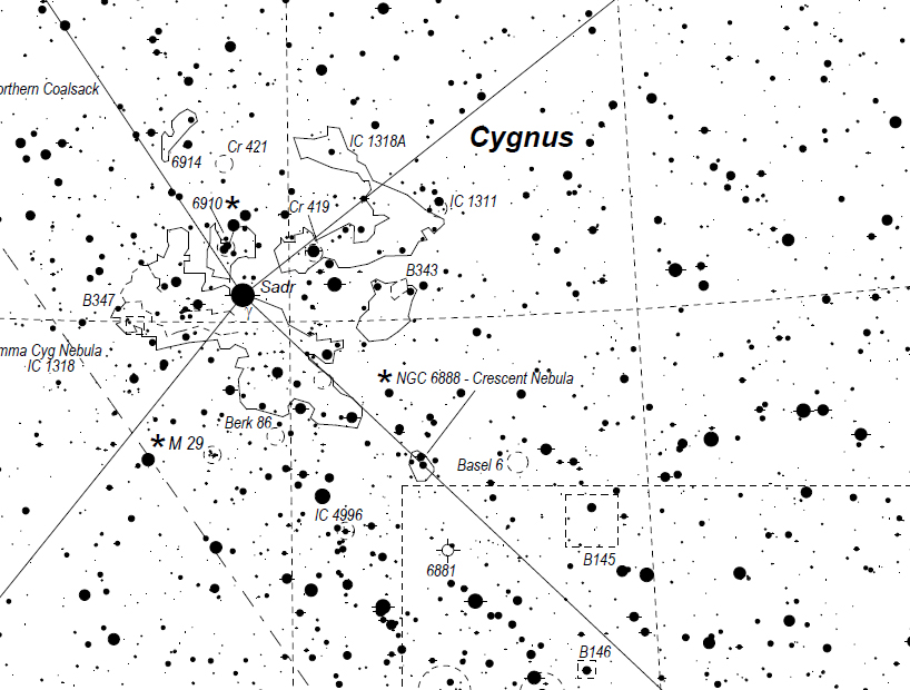 Name:The "Crescent" Nebula Constellation:Cygnus Instrument:8-inch F5 reflector with Sky Watcher coma corrector and a modified Nikon D3300. Exposure time: A stack of 16 five-minute exposures at ISO 800. Star Chart from Michael Vlasov's Deep sky hunter star atlas available on line https://www.deepskywatch.com/deep-sky-hunter-atlas.html |