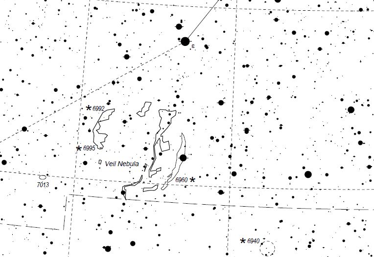 Name:The "Eastern Veil" nebula Constellation:Cygnus Instrument:8-inch F5 reflector with Sky Watcher coma corrector and an ASI 2600 MC (gain 100 -20c). Exposure time: A stack of 17 five-minute and 14 three-minute exposures. Star Chart from Michael Vlasov's Deep sky hunter star atlas available on line https://www.deepskywatch.com/deep-sky-hunter-atlas.html |