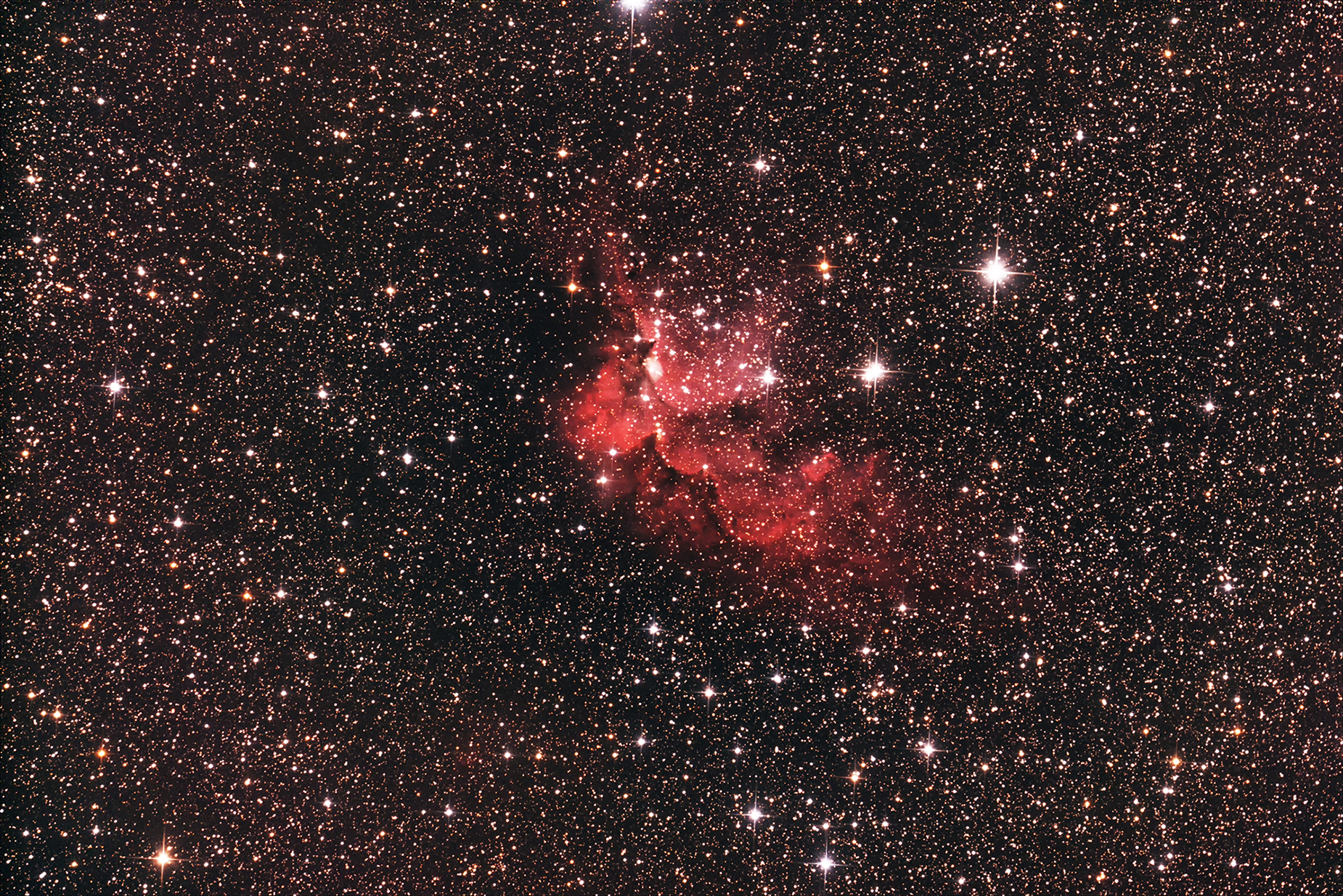 Name:The "Wizard" nebula Constellation:Cepheus Instrument: 8-inch F5 reflector with Sky Watcher coma corrector and a modified Nikon D3300. Exposure time:16 five minute exposures at ISO 800. Star Chart from Michael Vlasov's Deep sky hunter star atlas available on line https://www.deepskywatch.com/deep-sky-hunter-atlas.html |